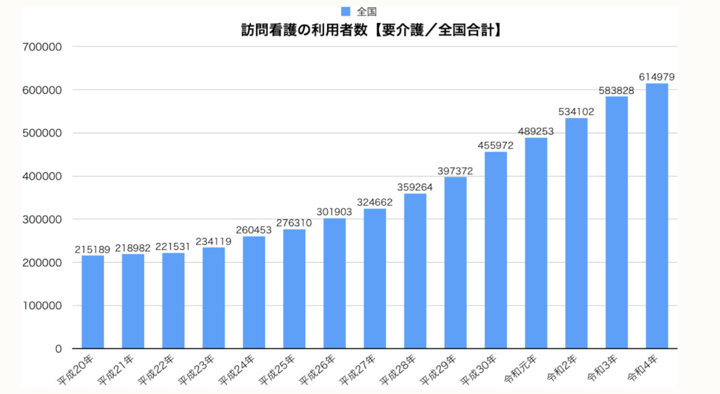在宅医療の中でも、特に訪問看護の需要は顕著です。訪問看護ステーションの数はここ15年間で約3倍に増加し、2025年時点で全国約18,743ヵ所まで拡大しています。また、訪問看護の利用者数自体も過去10年で約3倍に増加しており、患者・利用者の増加が明確に示されています。